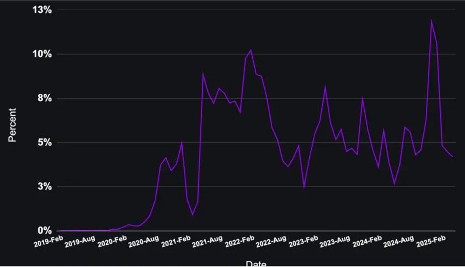 The trading volume of stablecoins in DeFi mainly comes from DEX. The proportion of DEX in the total trading volume will fluctuate with market sentiment and trading trends. Recently, the trading volume of memecoin has soared to more than 500 billion US dollars, accounting for 12% of the total trading volume.
