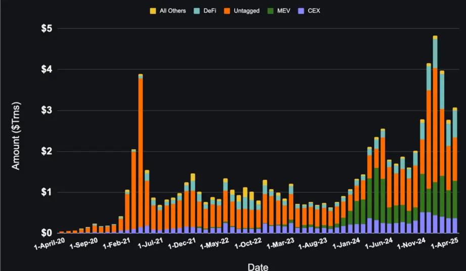 Total stablecoin volume has been climbing steadily since the summer of 2023, with particularly large increases during periods of high market activity. DeFi has seen the highest volume growth, while MEV and untagged wallets have high but volatile volumes.