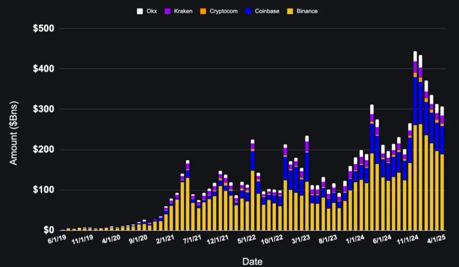 CEX trading volume does not reflect transactions on CEX platforms, as most transactions occur off-chain. Instead, it reflects user deposits and withdrawals, inter-exchange transfers, and internal operational activities.