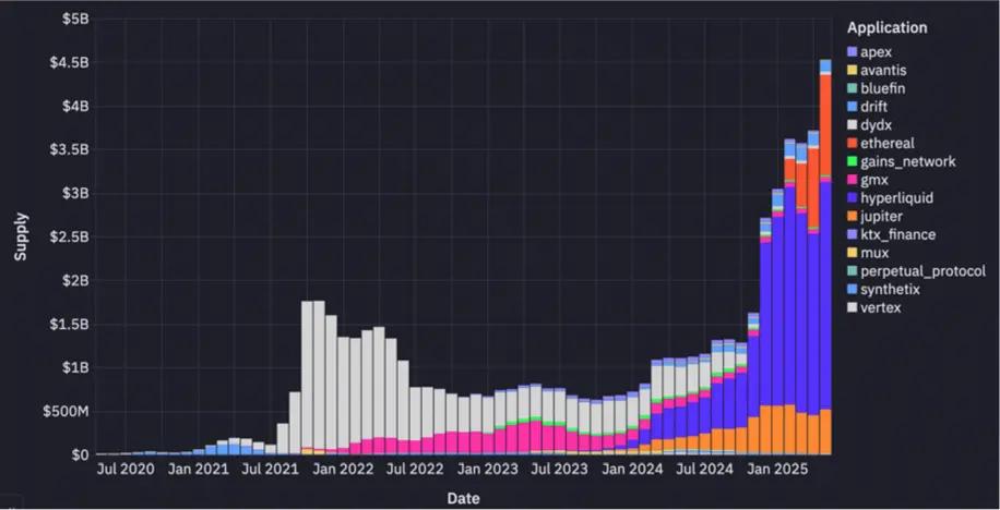 Supply rotates between various perpetual swap protocols over time, currently concentrated in Hyperliquid, Jupiter, and Ethereal.