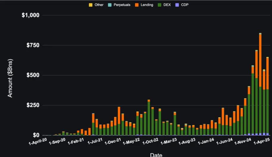 Over the past six months, DeFi monthly stablecoin trading volume has grown from approximately $100 billion to over $600 billion, led by huge growth in DEXs, lending, and CDPs.