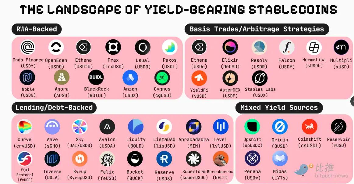 The revenue sources of yield-bearing stablecoins are diverse and can be summarized as follows: