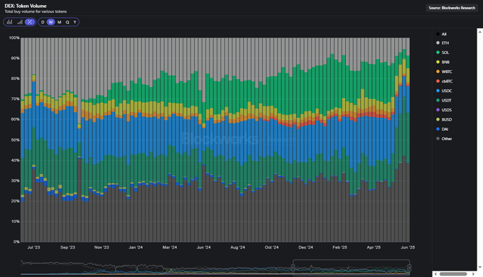 USDT and USDC consistently capture 30%+ of this volume, while network tokens ETH, BNB, and SOL account for another significant portion.