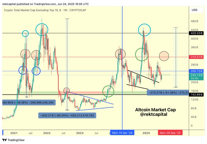 $ALTS Altcoin Market Cap indeed rejected from $425bn (black) And even though Altcoin Market Cap rejected very strongly... The retrace of -61% was much shallower than the previous 69% and 85% corrections Important sign that $425bn is weakening as a point of rejection #BTC #Crypto #Bitcoin