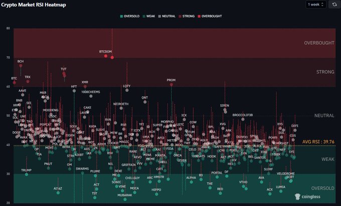With the bounce last week, we've seen the average Weekly RSI level of coins move up quite bit. The average of ~40 is still pretty neutral/low which is of course the case for many alts. Especially the mid/low caps. BTC is currently sitting in between the 60-70 range which is a good area to be. Not overbought but also indicating there's somewhat of a bullish weekly trend going. Alts still have a long way to go and still seem unable to string together multiple weeks of upside/outperformance against BTC. A few exceptions obviously.