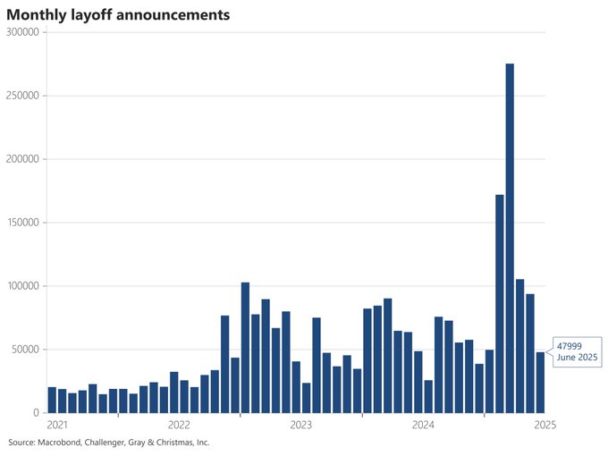 Job cut notices in the Challenger report were: • essentially flat in June from their year-ago levels • up 39% from a year ago in Q2 • down from much higher levels in Q1 Glass half-empty or glass half-full depending on which benchmark you want to use.