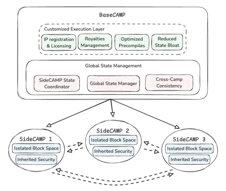 Camp Network's blockchain infrastructure consists of BaseCAMP and SideCAMP. BaseCAMP, as a "global state manager", centrally manages all network activities, recording IP registration, usage, and settlement, ensuring the credibility of the IP ecosystem. SideCAMP provides an independent execution space for each application, avoiding competition between different applications while enabling smooth interaction between different SideCamps through cross-messaging functionality.