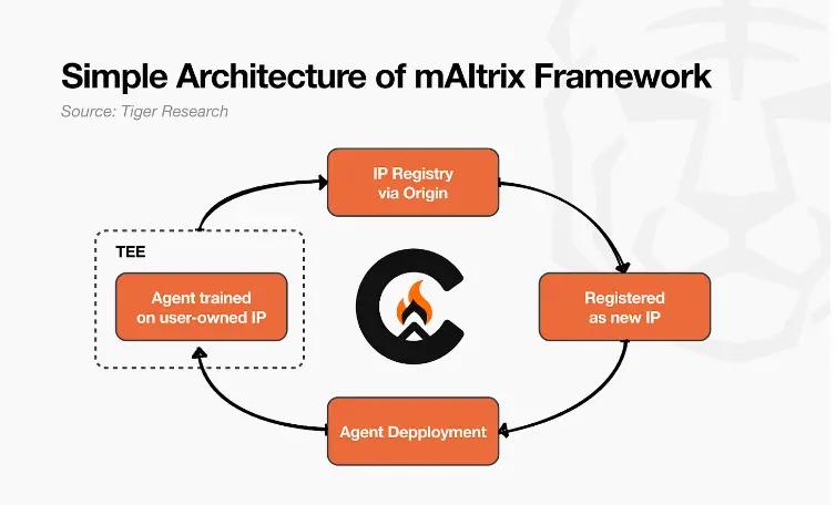The mAItrix framework provides an integrated SDK for AI agent development, training, and deployment. It works in coordination with the Origin framework, connecting the entire process into a complete pipeline, from training AI models using on-chain IP to generating derivative content through AI agents. mAItrix's core advantage lies in its respect for data ownership, using only data with clear attribution to avoid legal disputes.