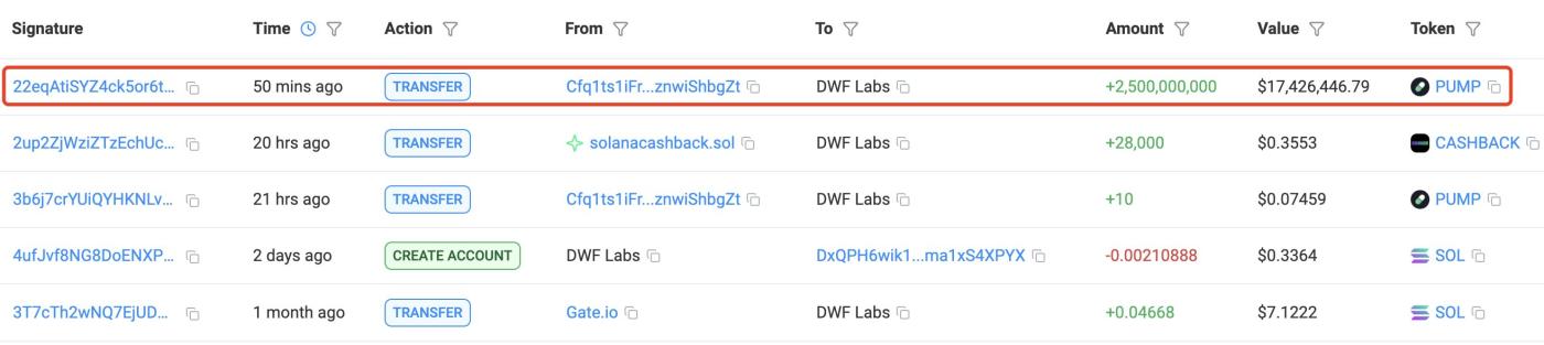 DWF Labs received 2.5 billion PUMP tokens