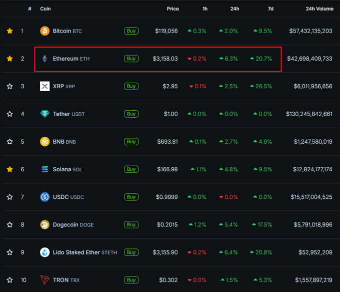 $ETH is the best performing top 10 coin in the past 24h once again.