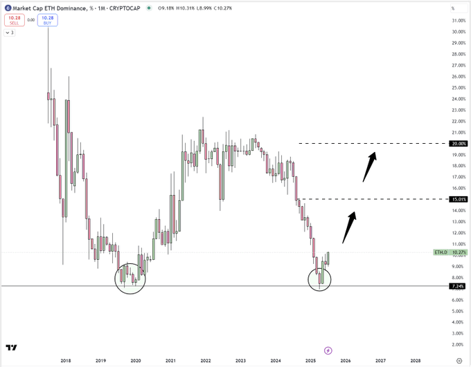 Ethereum Dominance just crossed 10% — first time since March 2020.