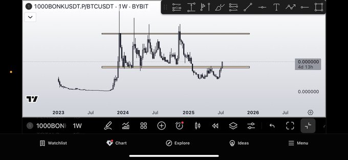 $Bonk /Btc weekly range. Still think bonk should be first Sol meme with a CB listing to be running into new highs. Flips 0.0.34 and will add back more exposure on it Also shoutout @ReaperL05 for mentioning this chart