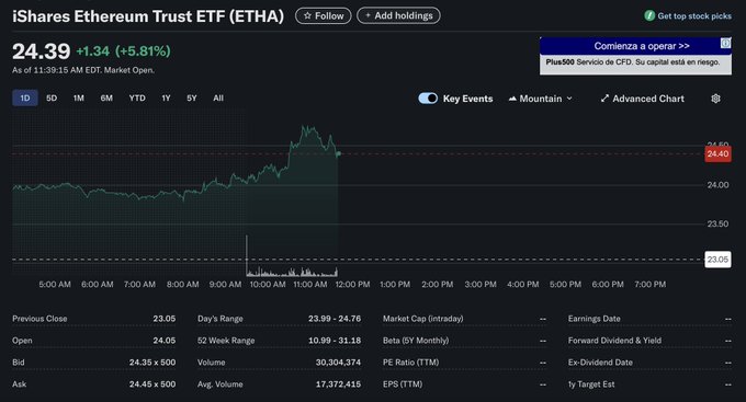 Only 2hr into NY open and $ETHA has now done $30m in volume (normal daily volume is 17m). All other $ETH ETFs seeing similar volume.