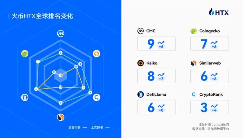 According to Kaiko's second quarter report for 2025, Huobi HTX has risen two places in the ranking of 45 mainstream spot trading platforms in the world, successfully ranked among the top eight in the world, and became the exchange with the greatest improvement in the Top 10. It ranks second in the world in both business and technology dimensions, and is also at the forefront of the industry in the field of "security". In addition, Huobi HTX's ranking in global authoritative data platforms such as Coingecko, CoinMarketCap, DefiLlama, and CryptoRank continues to rise, gradually becoming a first-tier platform in the minds of Web3 users.