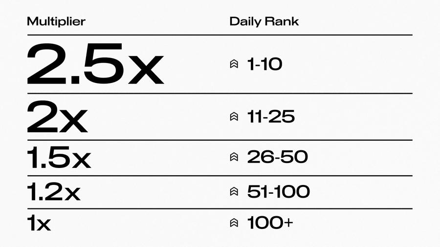 • First Month Points Multiplier: In the first 30 days, users ranking in the top 100 daily points can receive a minimum 1x points multiplier reward.
