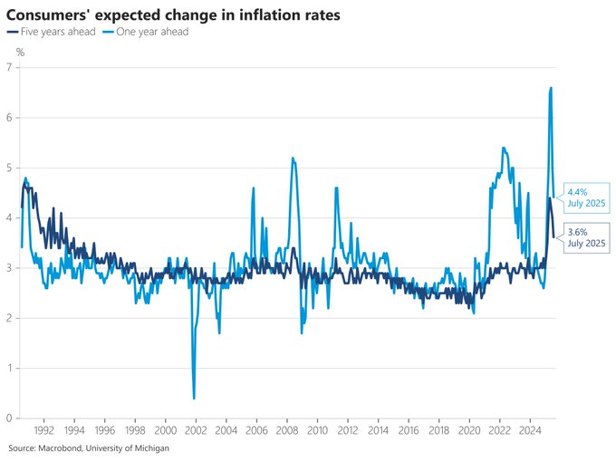 Inflation expectations declined to pre-Liberation Day levels in the University of Michigan survey though still remain well above the December 2024 level. Year-ahead expectations dropped to 4.4% in the preliminary July survey (5% in June) Five-years-ahead fell to 3.6% (prev 4%)