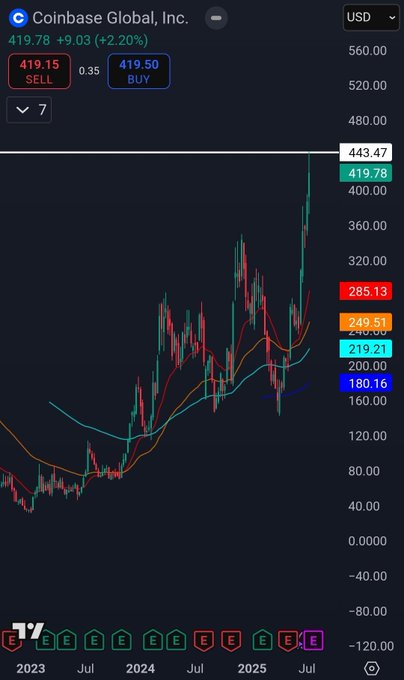 Took some profits on $COIN today in the $430's Still holding quite a bit for higher but it's always important to pay yourself and take profits especially taking out initial We'll see how the next few months go