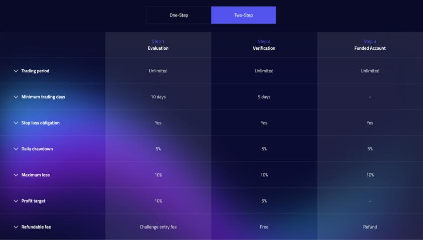 You need to pass a two-step evaluation challenge to get funded. The first phase requires a 10% profit target, and the second needs 5%. You will also need to manage risk carefully; the evaluation comes with a 5% daily drawdown limit and a 10% overall cap.
