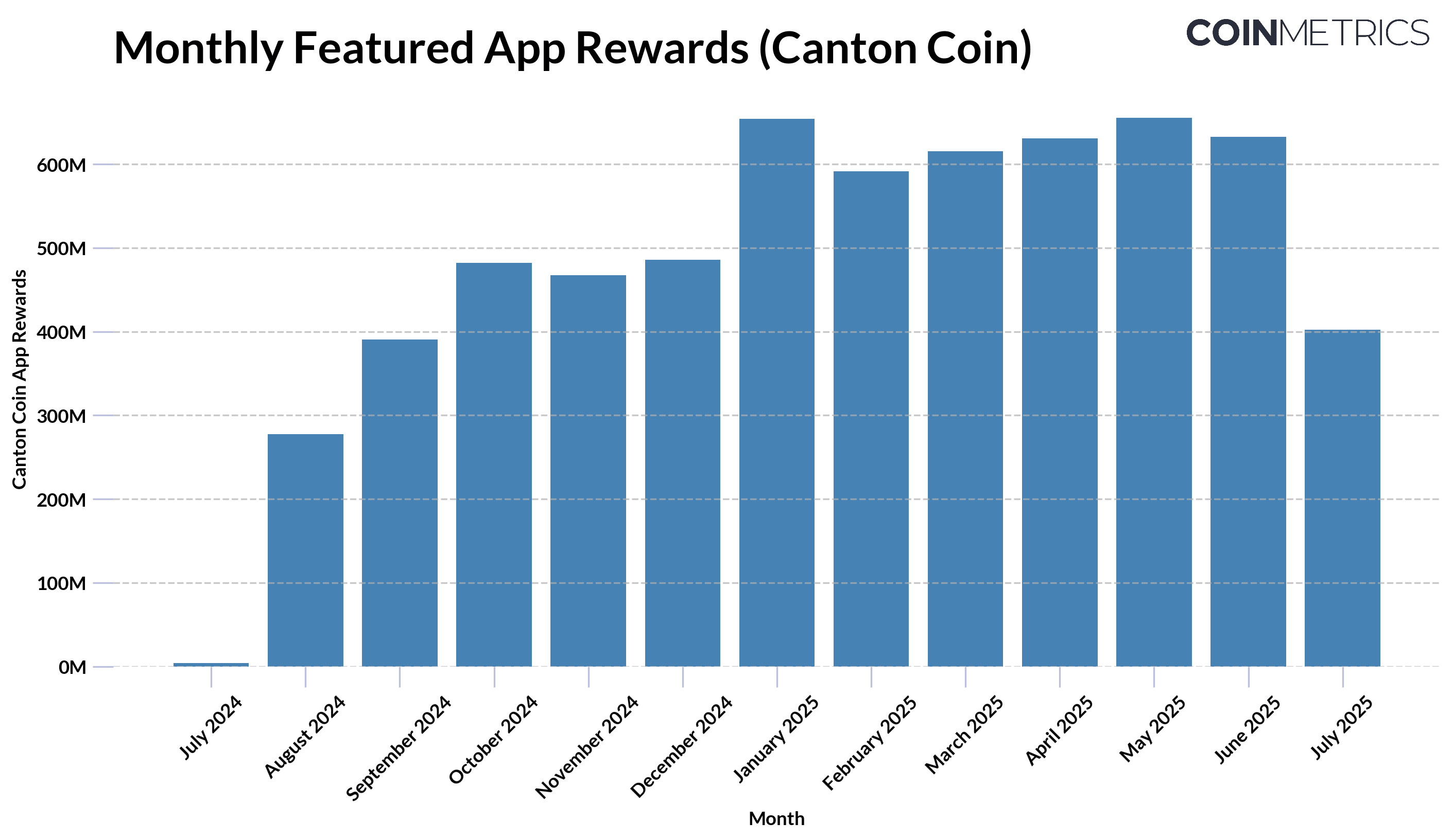 Coin Metrics’ ATLASTM provides visibility into the Canton Coin rewards tied to validators, applications and other sub-accounts. Below, we see the total monthly rewards earned by featured applications from new Canton Coin issuance. While rewards from issuance are set to decrease, rewards can scale as apps facilitate more transactions.
