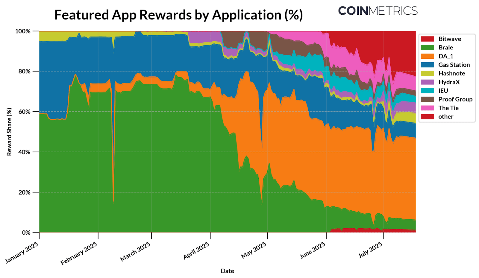 Application providers like Brale benefitted from an early mover advantage, initially capturing the majority of featured app rewards. Over time, applications like Digital Asset’s billing app and Gas Station have gained meaningful share. As more participants join the network, rewards are becoming more evenly distributed, shifting the focus toward sustained app usage.