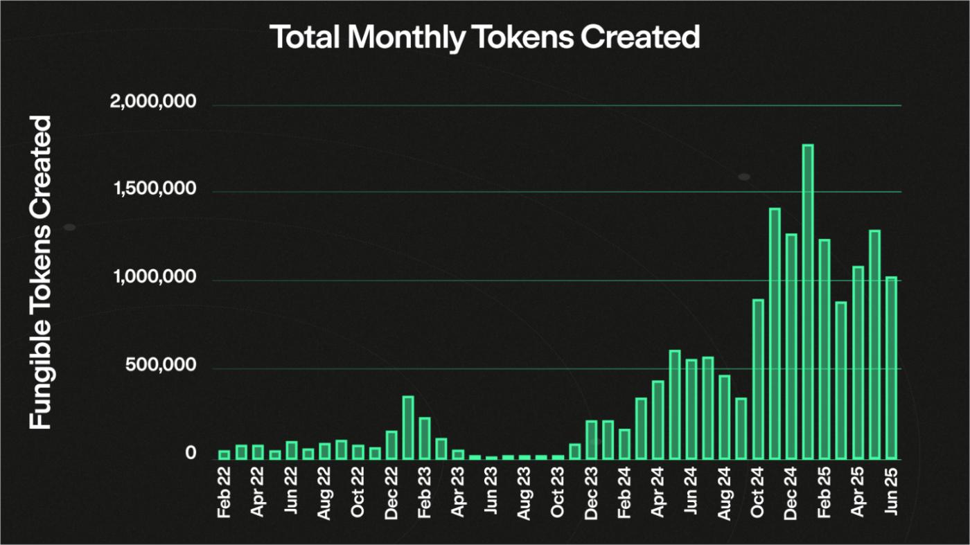 As of June this year, the Metaplex protocol has created over 920 million digital assets, with a cumulative transaction volume exceeding $10 billion, and over 11.5 million independent signed wallets. In June alone, over 1.1 million new tokens were created through Metaplex's Token Metadata standard, with 96% being regular fungible tokens outside of Non-Fungible Tokens, involving asset issuance platforms such as Pump.Fun, Bonk, Raydium, Jupiter, Believe, Meteora, TimeDotFun, and others.