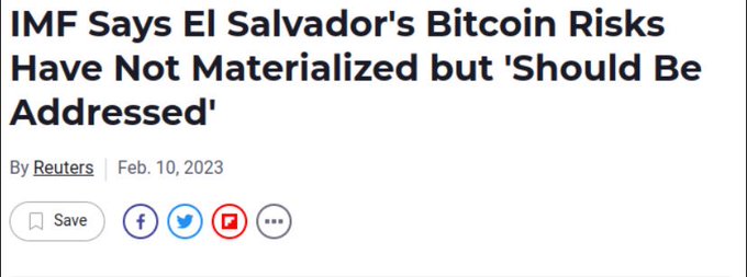 In February of 2023, the IMF stated; “Bitcoin risks [in El Salvador] have not materialized but ‘Should be addressed’