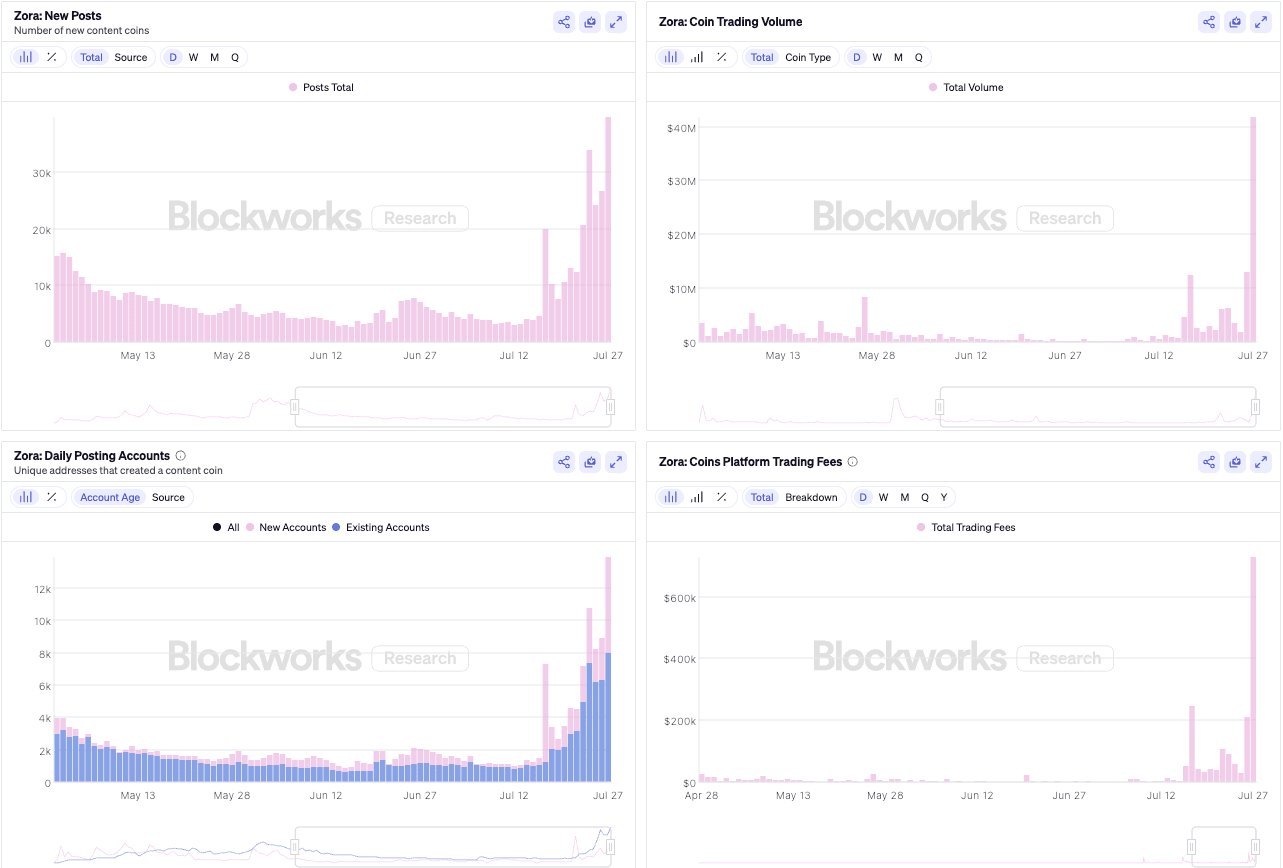 All statistics on Zora are on the upward trajectory, from new posts to trading volume to trading fees. Interestingly, the Zora token has done about 865%+ in the last 30 days - that screams product-market fit.