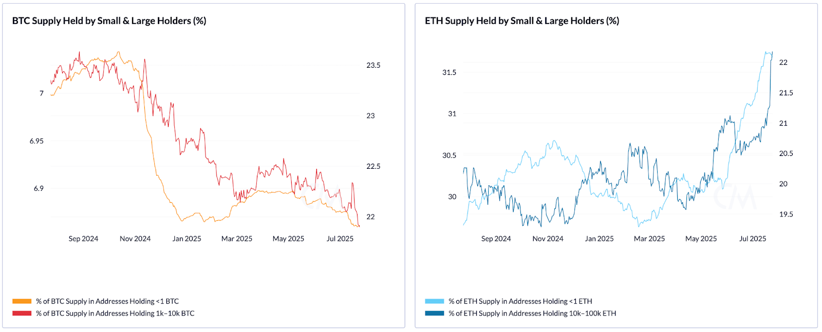 As seen in the charts above, BTC supply held by both small (<1 BTC) and large (1k–10k BTC) holders has gradually declined over the past year, suggesting a period of distribution as prices reach elevated levels. In contrast, ETH shows signs of renewed accumulation, particularly among large holders (10k–100k ETH), whose share of supply has recently climbed to over 22%. The supply held by small ETH holders (<1 ETH) has also increased, continuing a steady rise that began in 2021.