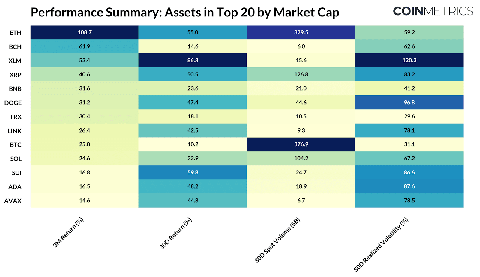 The table below provides a summary of market stats for tokens among the top 20 in market cap, excluding stablecoins and other on-chain derivatives: