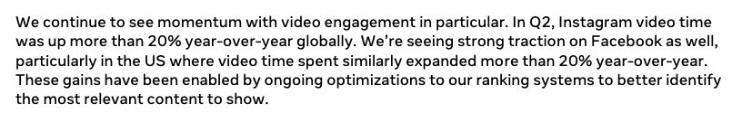 Packy note: I’m mixed on this one! We included it because Zuck’s vision for Personal Superintelligence is great, and he’s pulled together an All-Star team to build it. BUT there’s what Zuck says, and the job AI is currently doing for Meta. In its Q2 earnings Prepared Remarks, the company wrote: