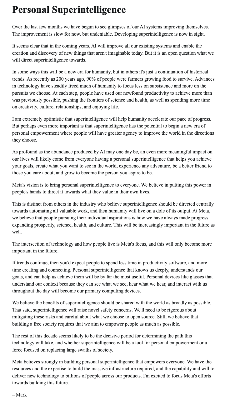 In sharing this update, Zuck also laid out Meta’s AI business strategy called “Personal Superintelligence” or AI embedded in everyday devices (like AR glasses) that deeply understand and assist individuals. According to Zuck, unlike those big bad Other AI labs that just want to automate your work and steal your jobs (good framing, Meta PR), Personal Superintelligence is designed to empower billions of people to pursue their own goals using AI tailored to them.