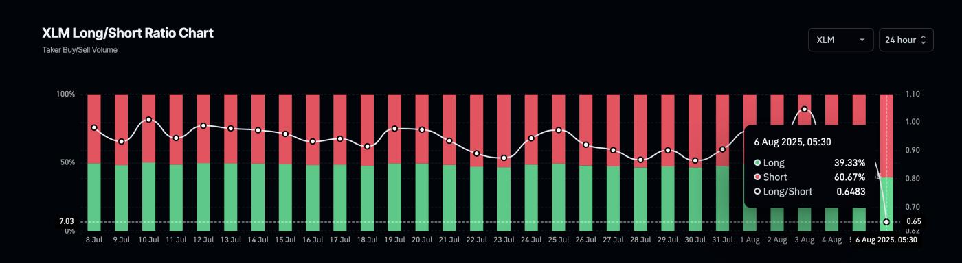 The shift is also clear in the long/short account ratio. According to Coinglass, 60.67% of traders are currently holding short positions on XLM, a sign that most expect the Stellar (XLM) price to fall further. While a heavily shorted market can sometimes lead to a short squeeze, in this case, it aligns with the negative Stellar price action and trend indicators.