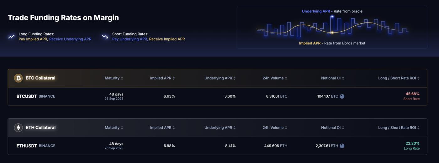 The initial launch supports Binance ETH and BTC perpetuals. In essence, Boros creates an onchain market for fixed-vs-floating funding rate swaps, allowing traders and protocols to directly hedge the funding cost risks that come with directional leverage. Think of it as building a “funding rate derivatives layer” that can plug into the broader DeFi ecosystem.