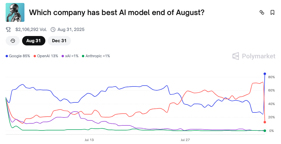 Long-time readers of the Dose will know that we have been long-time “Google DeepMind is way more impressive than it gets credit for” truthers. After its upgrades and OpenAI’s somewhat underwhelming GPT-5 release, predictors on Polymarket now assign an 85% chance to Google having the best AI model at the end of August. What a TRANSFORMation.