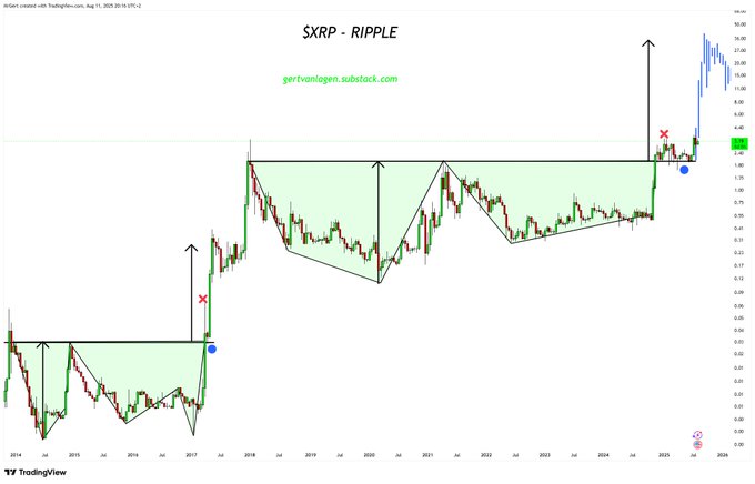 $XRP [2W] – Ripple is ready to rip. The 7-year double bottom has broken out at ❌ The neckline was successfully retested at 🔵 ATH cleared — first target near ~$34, at 2.00 fib. extension of double bottom. --> Compare with 2014-2017 setup