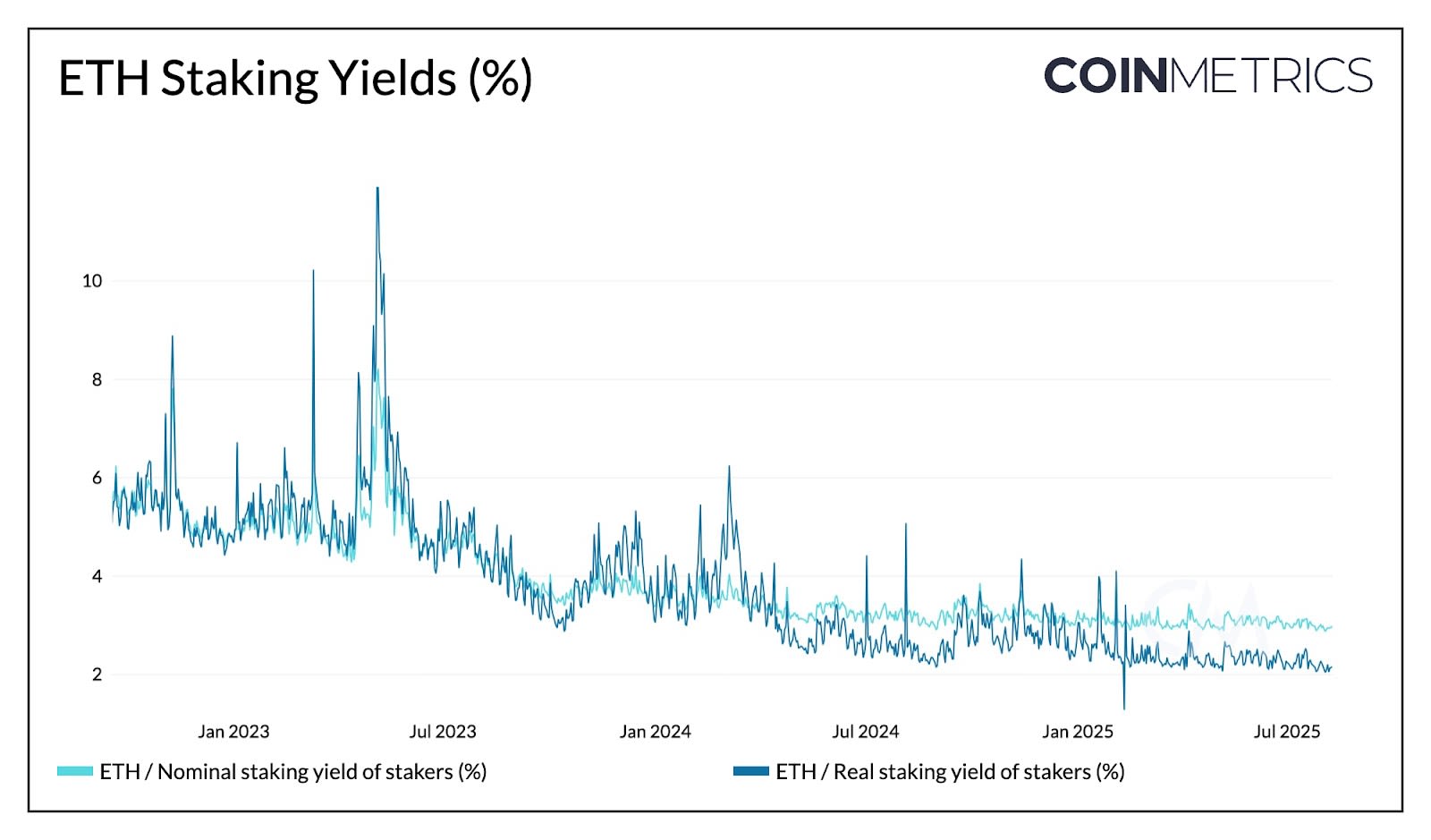 Ethereum currently offers 2.95% nominal and 2.15% real (inflation-adjusted) yield through staking rewards for securing the network. This can provide treasury companies with a steady stream of income in addition to the price appreciation of the underlying asset. For example, if 30% of the 2.2M ETH held by treasury companies today were staked at the current ~3% nominal yield and a $4K ETH price, it could generate roughly $79M in annual income. While an influx of staking could compress yields, the effect would be modest since Ethereum’s reward rate decays gradually as the total amount staked increases.