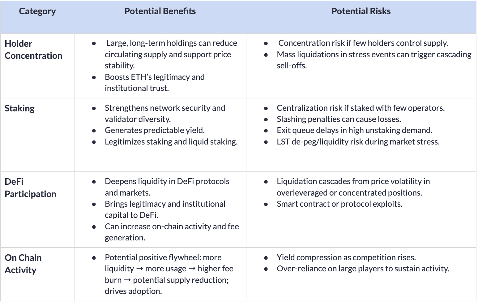 As publicly listed ETH treasuries expand their on-chain footprint, their financial performance increasingly carries implications for Ethereum’s long-term network health, linking off-chain corporate outcomes to potential on-chain effects. Large, long-term holdings can reduce circulating supply, boost legitimacy, and deepen on-chain liquidity, but concentration, leverage, and operational risks mean that outcomes at the corporate level could spill over into the network.