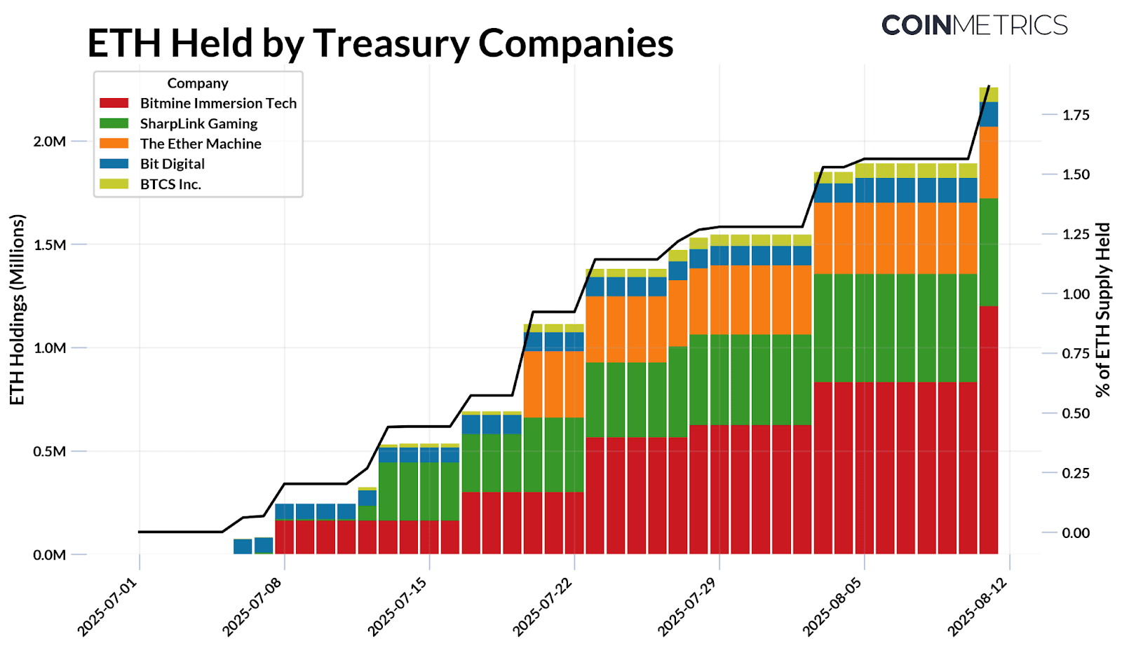 ETH-focused digital asset treasuries are rapidly scaling, with 2.2M ETH (1.8% of supply) accumulated in just two months, creating a supply-demand imbalance.