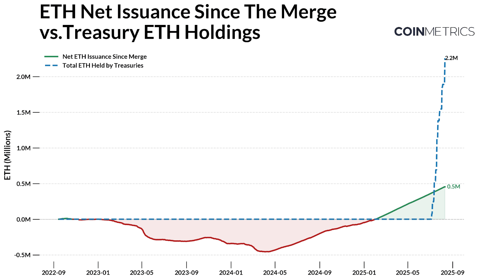 Since “The Merge” in September 2022, a total of 2.44M ETH has been issued, while 1.98M ETH has been burnt, resulting in a net supply growth of 454.3K ETH. Since July, ETH treasury companies have collectively accumulated 2.2M ETH, far exceeding net new issuance over the same period. While Bitcoin’s capped supply and halving schedule directly reduce new issuance over time, Ethereum’s supply is dynamic and currently inflationary. This makes the scale and pace of recent demand even more notable given that ETH’s market cap is roughly 4.5x smaller than BTC’s.