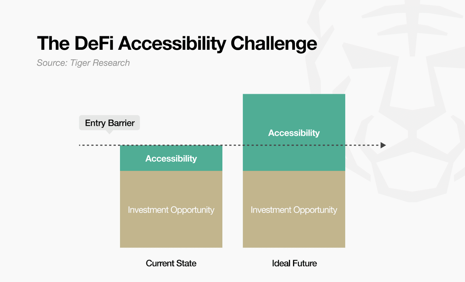 DeFi aims to create an open financial ecosystem where anyone can participate freely. However, it requires complex technical knowledge and advanced financial skills, creating a large gap between ideal and reality.