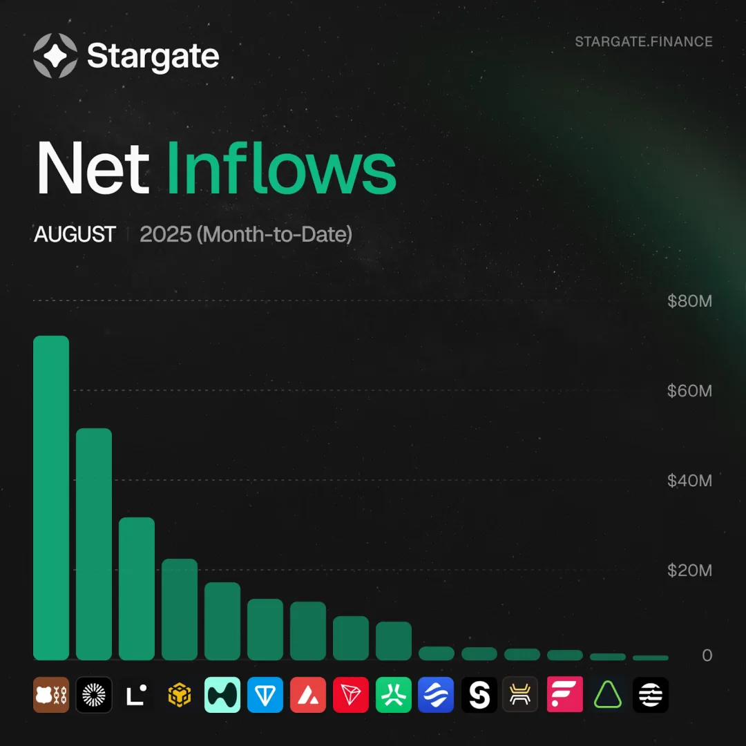 Therefore, Dolomite's strong rise is expected to further bring capital inflow, promoting both Berachain's TVL and user numbers, nourishing ecosystem project prosperity and systemic growth, ultimately forming a self-consistent positive closed loop within the ecosystem. It is worth mentioning that according to Stargate's cross-chain bridge net inflow data published in August 2025, Berachain has topped the net inflow list, far exceeding other mainstream chains, further verifying its strong gold-absorbing ability and capital preference in the current market cycle.