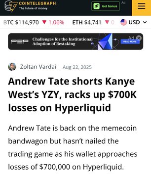 👀 INSIGHT: Andrew Tate lost $700K shorting Kanye West’s YZY token on Hyperliquid.