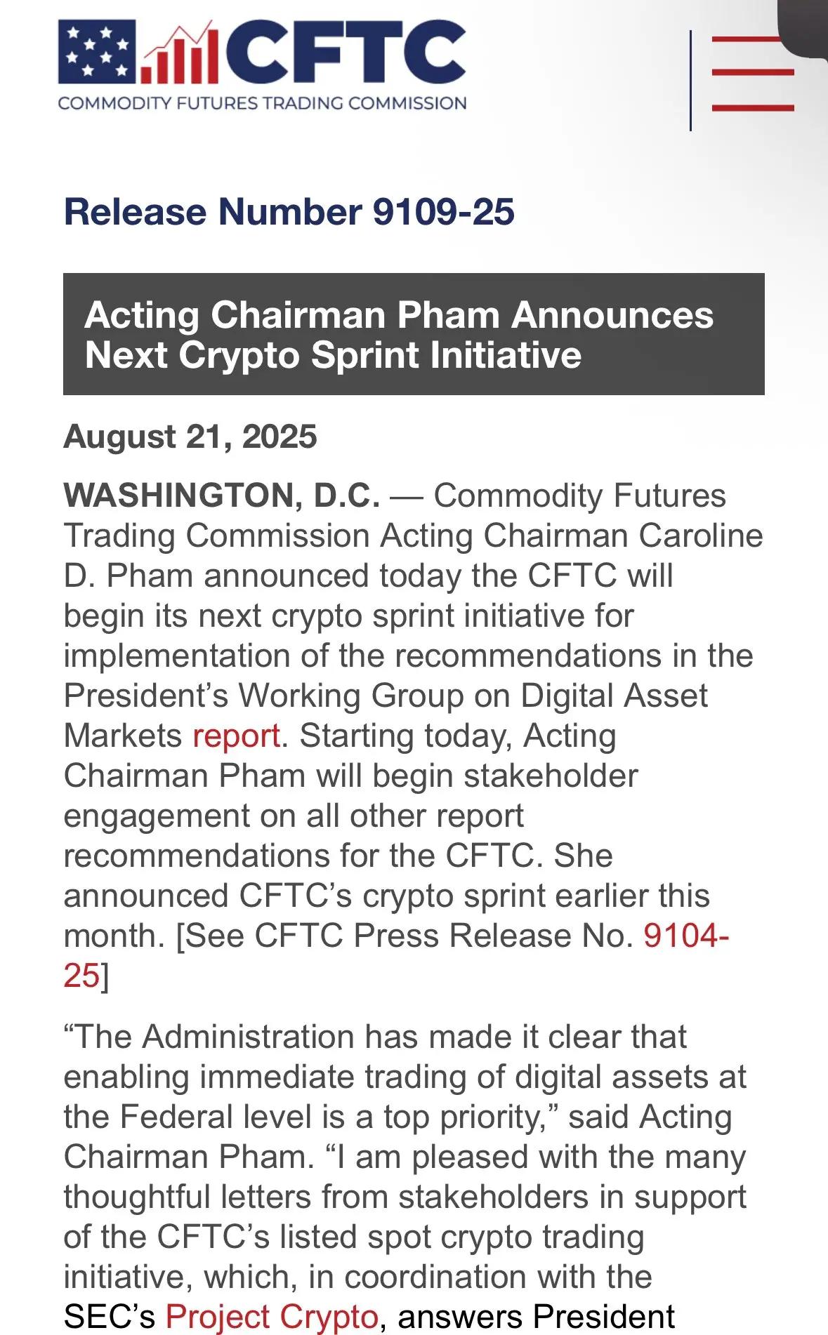 CFTC Acting Chairwoman Caroline D. Pham announced the launch of a new round of the "Crypto Sprint Initiative." Its core goal is to rapidly implement the recommendations of the President's Digital Asset Markets Task Force report, establishing the promotion of spot trading of digital commodities at the federal level as a "top priority." This signals the regulator's transition from policy announcements to efficient implementation and implementation.