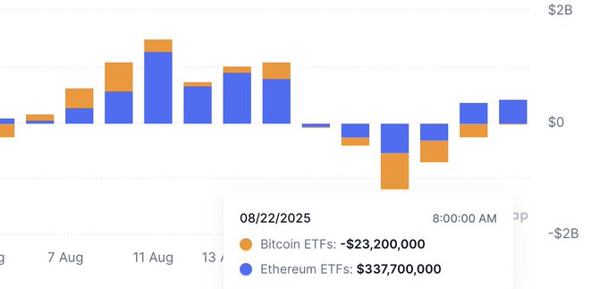 Looking at the chart, the trend couldn't be more clear. On August 22, Bitcoin recorded a net outflow of $23 million, while Ether saw a net inflow of $338 million. #Ethereum #Bitcoin