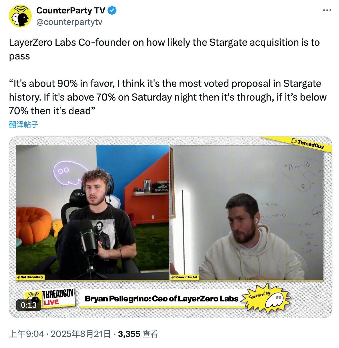 After the vote began, it quickly surpassed the minimum required number of votes, with support at one point soaring to over 97% (according to the rules, a vote is considered passed if it exceeds 70% by the end). LayerZero co-founder Bryan Pellegrino even proudly boasted on the CounterParty podcast, “This is the highest-turnout vote in Stargate history.”