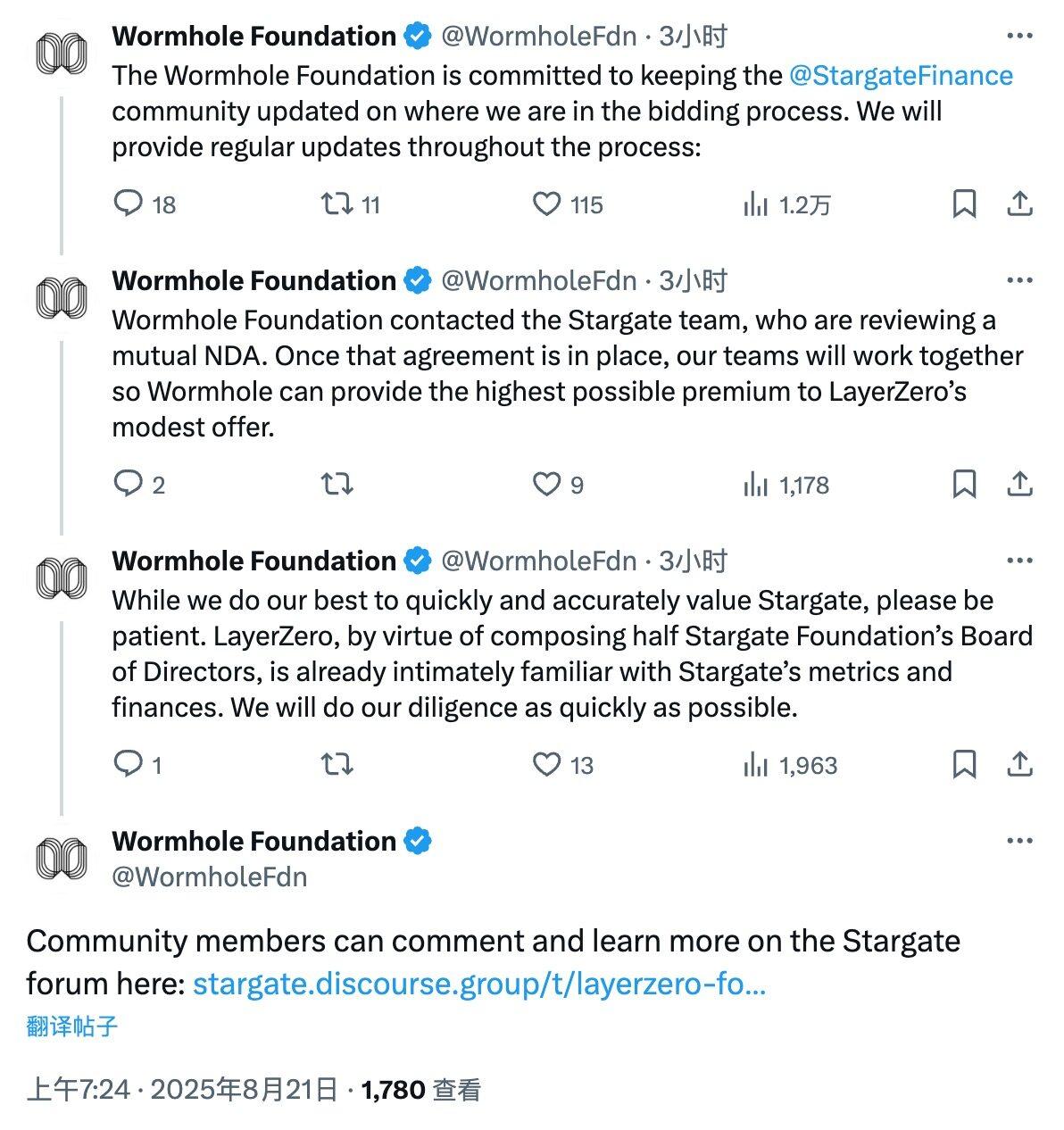 On August 21, LayerZero’s direct competitor, the Wormhole Foundation, publicly announced on X that LayerZero’s approximately $110 million acquisition offer for Stargate underestimated Stargate’s protocol assets and growth. Therefore, Wormhole plans to submit a higher offer and request a suspension of the current Snapshot vote for 5 working days to improve the bidding process and protect the interests of STG holders.