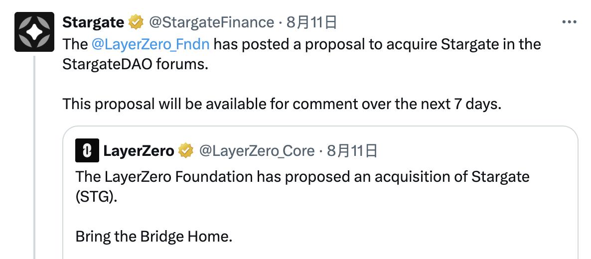 Regarding LayerZero’s acquisition proposal for Stargate, it can be traced back to August 11th – please refer to ” LayerZero proposed to acquire Stargate: both tokens soared by 20%+, but this group strongly opposed it .”