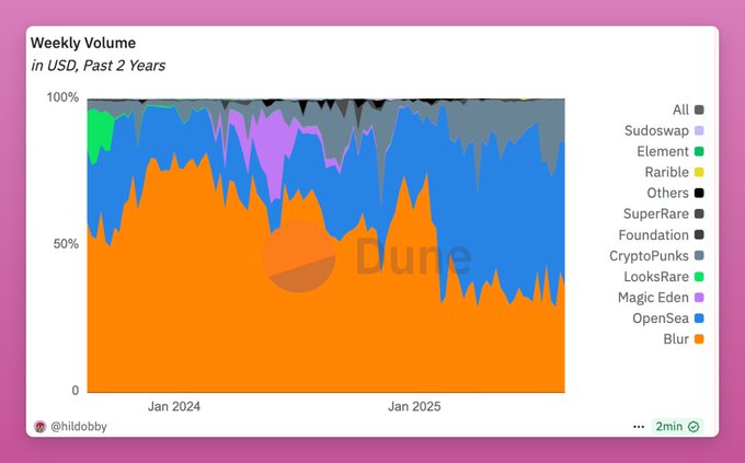 Opensea teased $SEA 8 months ago. Unfortunate, since $SEA would’ve been a great trade (and airdrop). Yet even without a token (or maybe because of airdrop speculation), Opensea came back on top, thanks to real users, brand partnerships, and trust as the 'default' NFT marketplace. Volume is only slightly higher, but Opensea now has 5x more active wallets, and 10x more trading txs than Blur. In short, Opensea owns the retail while Blur the professional traders. This cycle can't end without $SEA launch.