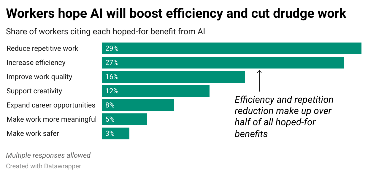 Hopes: Workers want AI to take over the boring parts of their jobs. The top hoped-for benefits were reducing repetitive work and increasing efficiency.