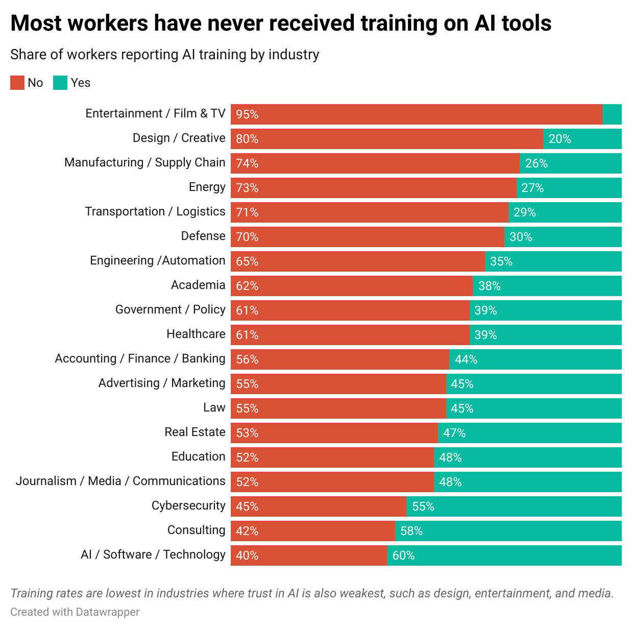 Only about 60% of workers have received AI training, and training rates are especially low in low-trust industries like Design/Creative (20% trained) and Entertainment/Film & TV (5% trained).